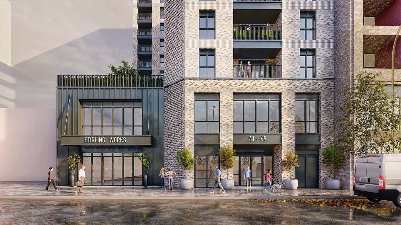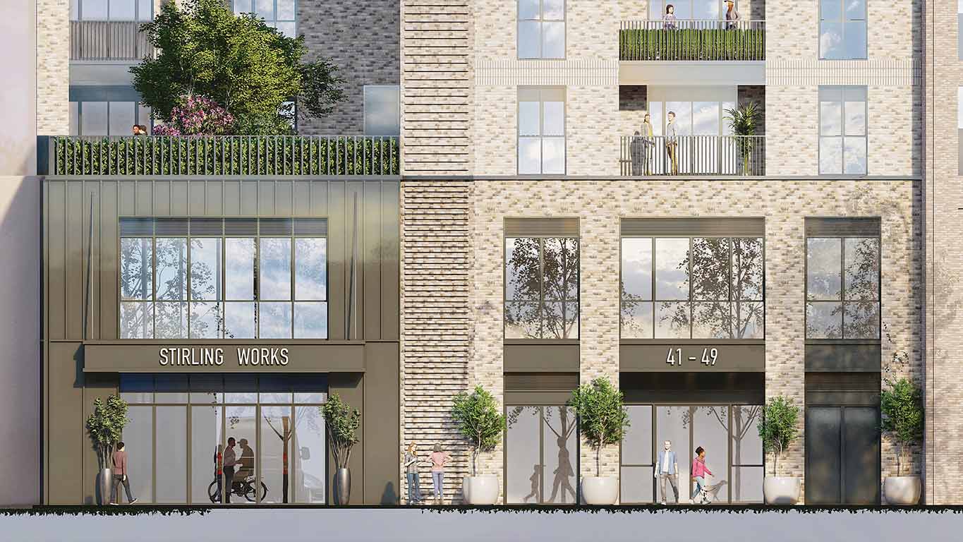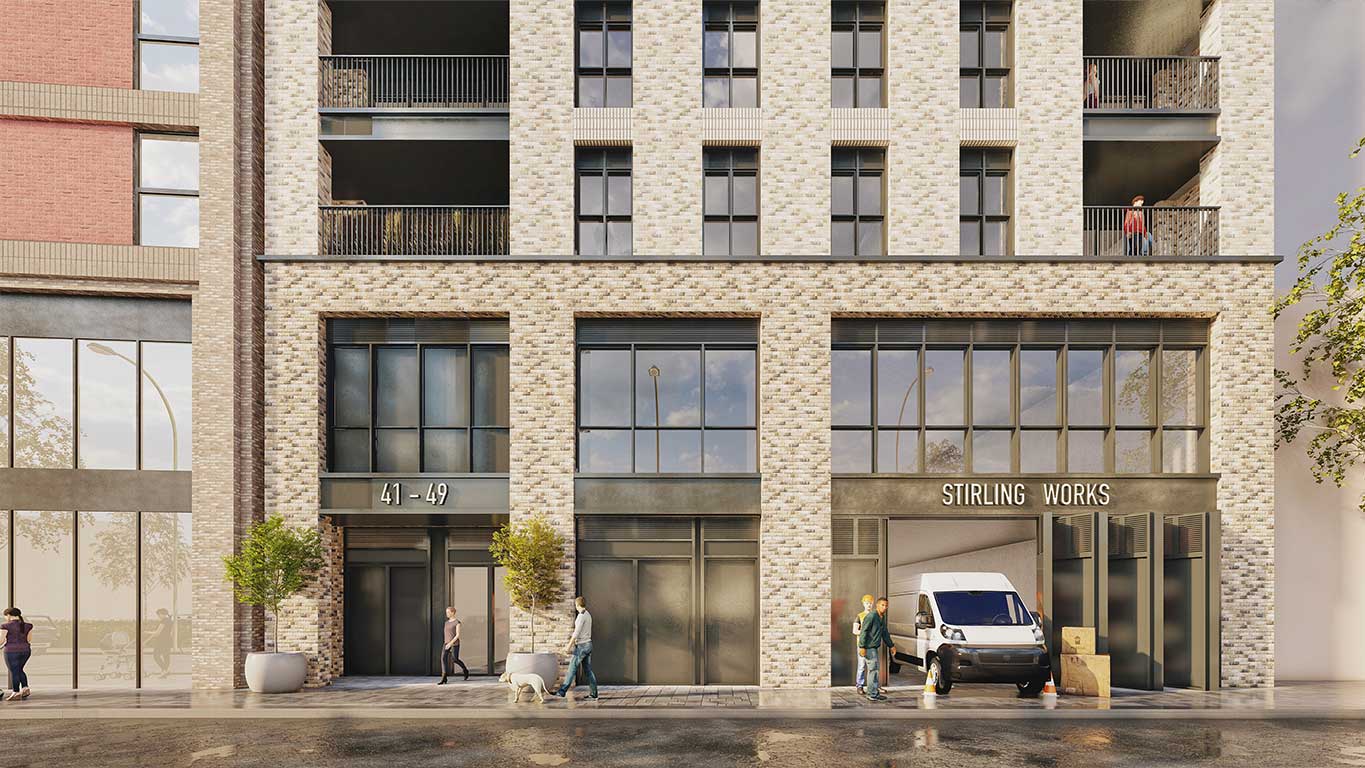 Stirling works is a new and exciting mixed use residential scheme proposed at 41-49 Stirling Road. The building has been designed to provide c. 50 high quality homes which will be both private and affordable tenure. Light industrial use will be provided across the ground and first floor areas to replace the existing low quality warehouses. The proposal has three garden areas, one on the podium at 2nd floor and two at the roof terraces, providing child play space, external seating and bio diverse planting. Photovoltaics, air source heat pumps, and green roofs have been provided, as well as an efficient building fabric to create a sustainable development which keeps energy consumption low. The provision of 4 blue badge car parking spaces and a loading bay will also be delivered on Stirling Road and Bollo Lane as part of the improved street condition.