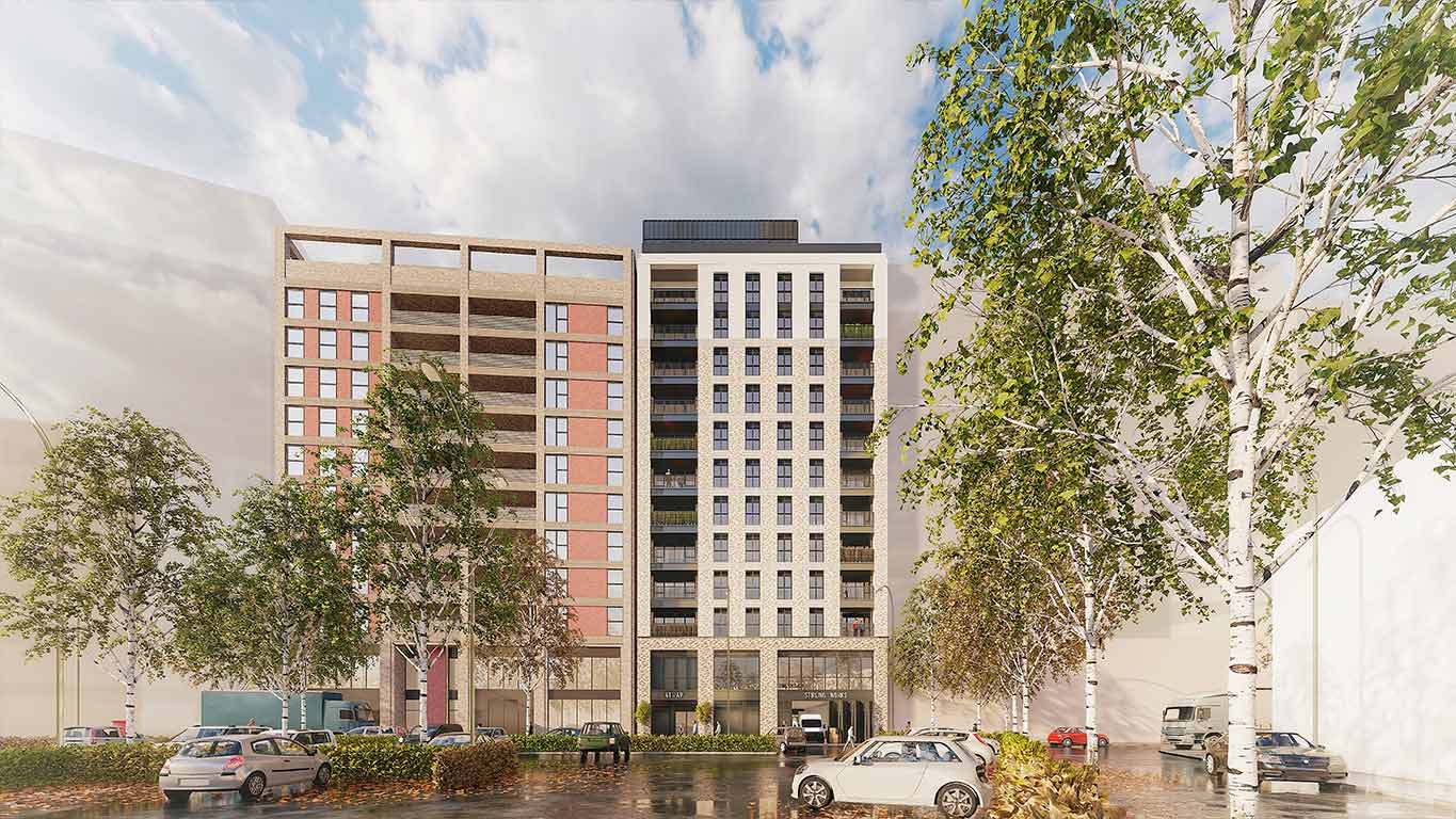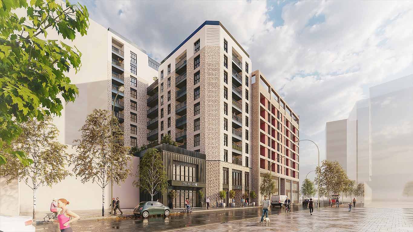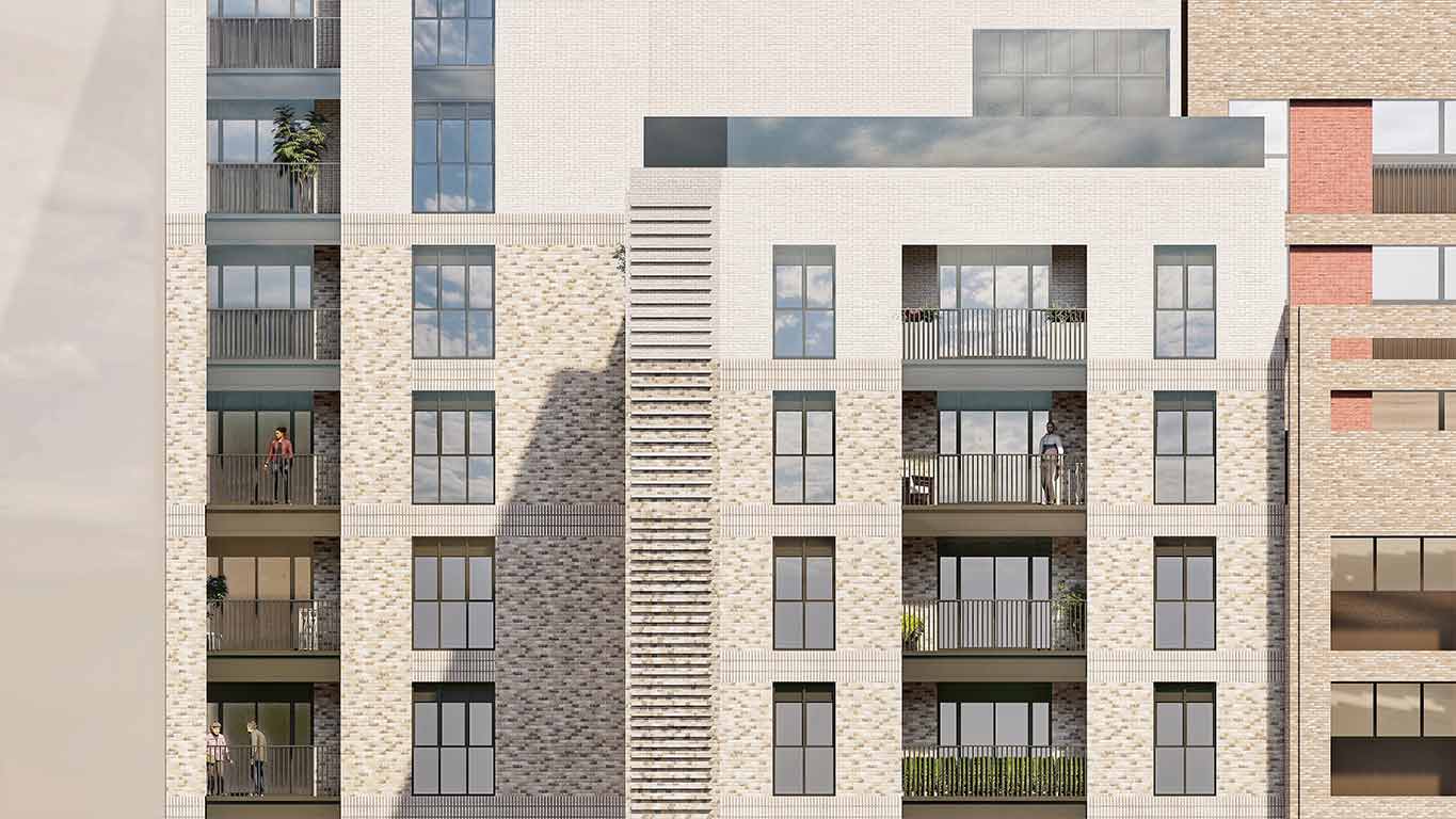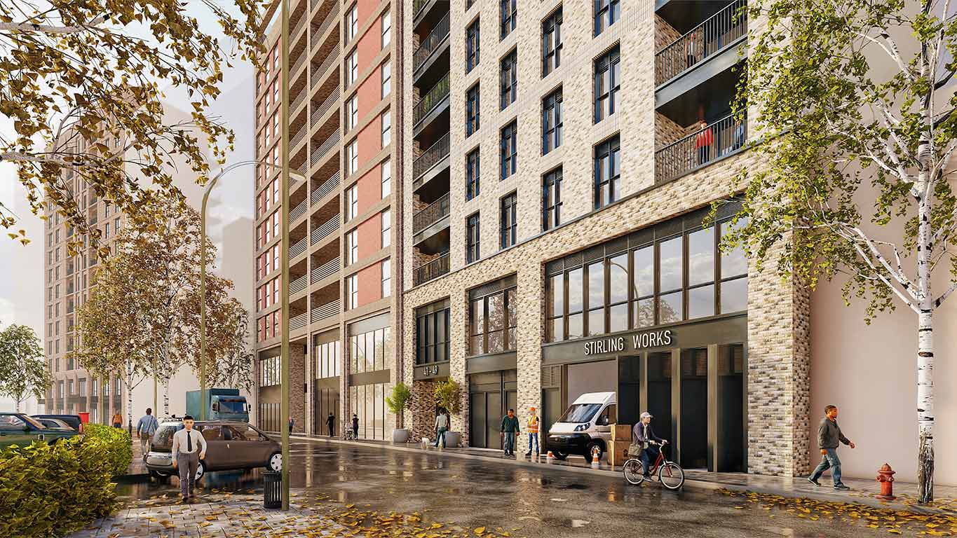Stirling works is a new and exciting mixed use residential scheme proposed at 41-49 Stirling Road. The building has been designed to provide c. 50 high quality homes which will be both private and affordable tenure. Light industrial use will be provided across the ground and first floor areas to replace the existing low quality warehouses. The proposal has three garden areas, one on the podium at 2nd floor and two at the roof terraces, providing child play space, external seating and bio diverse planting. Photovoltaics, air source heat pumps, and green roofs have been provided, as well as an efficient building fabric to create a sustainable development which keeps energy consumption low. The provision of 4 blue badge car parking spaces and a loading bay will also be delivered on Stirling Road and Bollo Lane as part of the improved street condition.